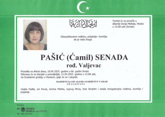 PAŠIĆ (Ćamil) SENADA 21.04.2025. godine u 15:00 sati 20. Aprila 2025. PAŠIĆ (Ćamil) SENADA 21.04.2025. godine u 15:00 sati
