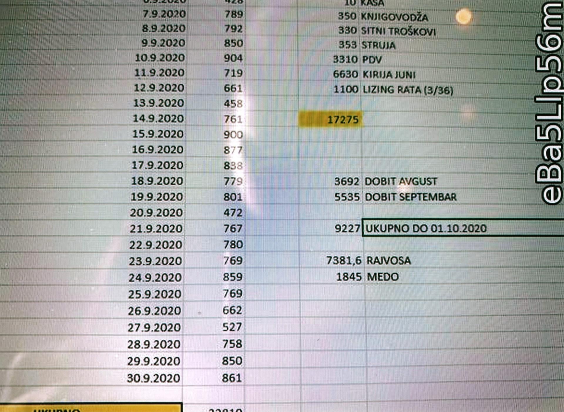 Na drugoj fotografiji se može vidjeti kako je dijeljen novac, odnosno dobit sa jednog od parkinga među učesnicima ove grupe. Prema podacima iz ove evidencije vidi se da je dobit iznosila više od 9.000 maraka za dva mjeseca, te da je korisnik Sky aplikacije pod imenom Rajvosa, što je Sky nadimak Seida Hadžibajrića, dobio nešto više od 7.000 KM, dok je Medo, što je Sky nadimak Elmedina Karišika, dobio blizu 2.000 KM.