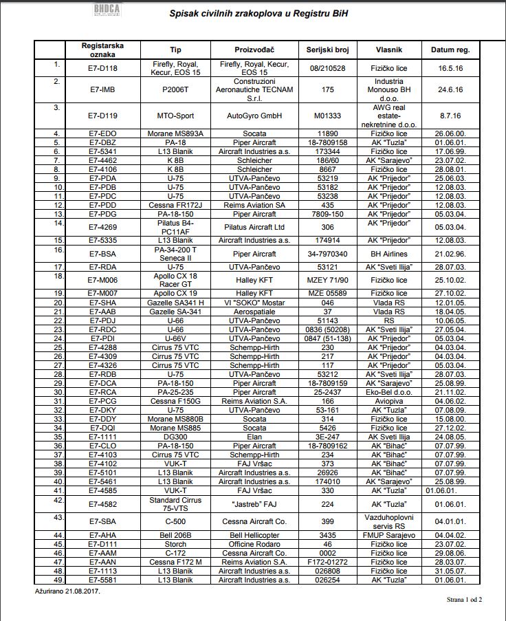 U nastavku pogledajte spisak privatnih zrakoplova u Bosni i Hercegovini i njihove vlasnike, dostupan na BHDCA.