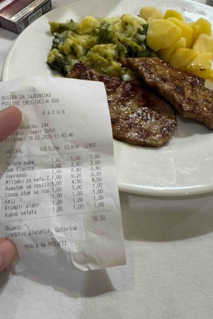 Porcija svinjskog vrata sa roštilja košta 3,50 KM, pekarski krompir kao prilog jednu marku, a ako političaru, u brizi za standard građana, padne šećer, može da se zasladi kolačem koji će platiti 1,50 KM.