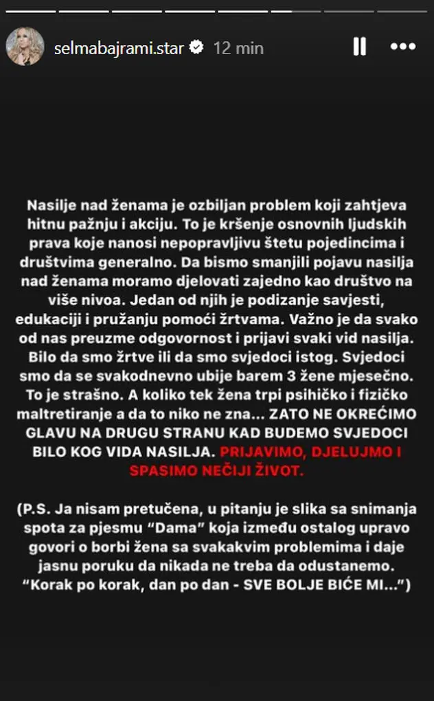 Bilo da smo žrtve ili svjedoci istog”, napisala je pjevačica između ostalog i otkrila da ona nije pretučena nego da se radi o snimanju spota.