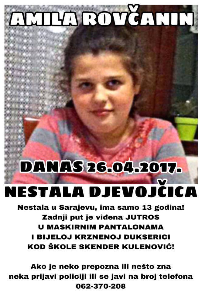Porodica traga za trinaestogodišnjom djevojčicom Amilom Rovčanin koja je jutros nestala iz naselja sarajevskog naselja Dobrinja, a iza sebe je ostavila oproštajno pismo.