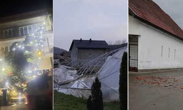 Lokalni portali iz Fojnice prenose da je novogodišnja jelka u centru grada oborena, a podijelili su i fotografije na kojima se vidi da je vjetar odnio plastenike te obarao stabla.