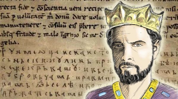 – Ja, ban’ bos’n’ski Kulin’ prisezaju tebe kneže Kr’vašu i v’sim’ građam’ Dubrov’čam’ pravi prijatelj’biti vam’od’sele i do vieka i pravi goj dr’žati s’vami pravu vieu dokol s’m’ živ.