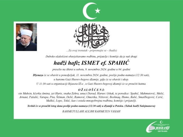 Dženaza hafizu Ismet-ef. Spahiću, bivšem zamjeniku reisul-uleme, dugogodišnjem profesoru Gazi Husrev-begove medrese i hatibu Gazi Husrev-begove džamije u Sarajevu, bit će obavljena u ponedjeljak, 11. novembra.
