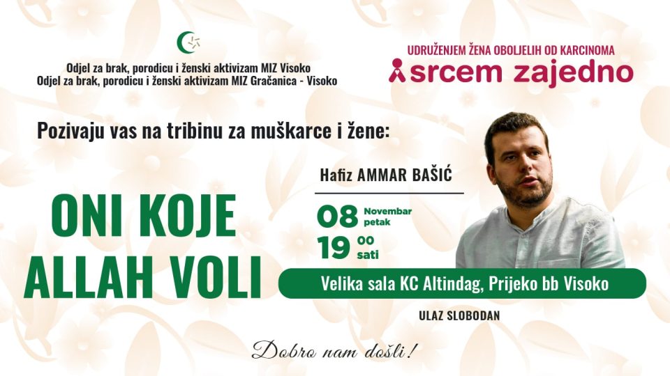 U organizaciji Odjela za porodicu, brak i ženski aktivizam MIZ Visoko i MIZ Gračanica, a u saradnji sa Udruženjem žena oboljelih od karcinoma i JU Centar za kulturu, sport i informisanje Visoko, 8. novembra ove godine sa početkom u 19 sati, u velikoj sali Kulturnog centra Altindag-Visoko, biće održana tribina za muškarce i žene pod nazivom “Oni koje Allah voli” na kojoj će predavač biti hfz. Ammar Bašić.