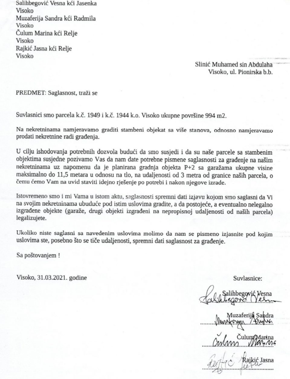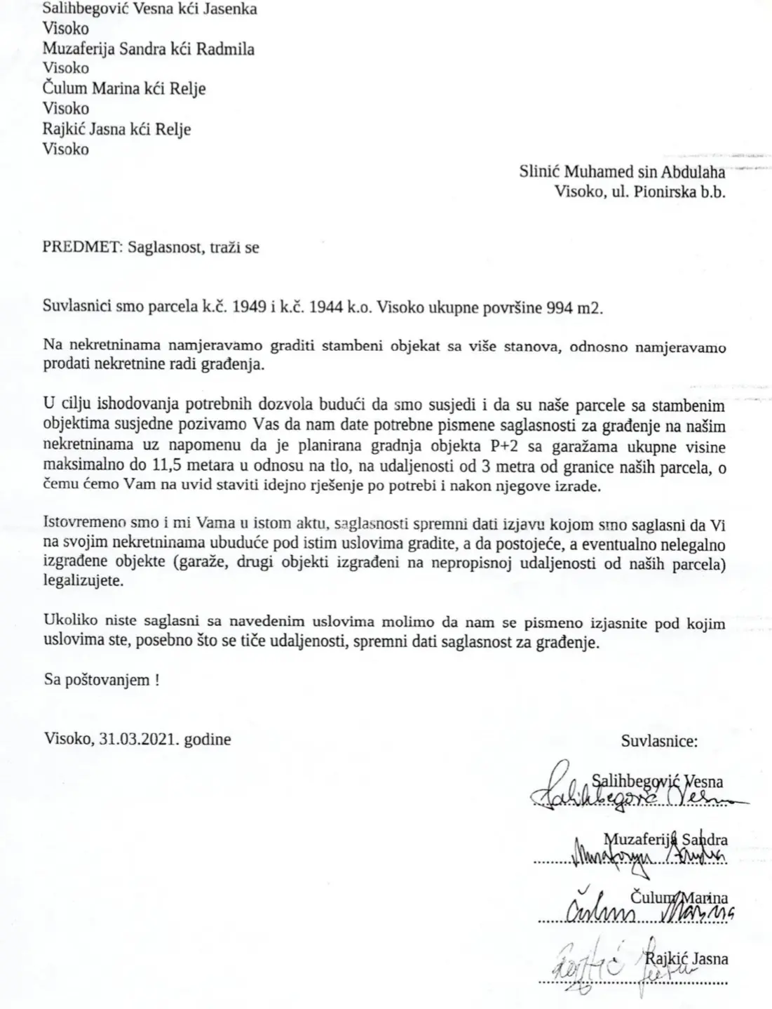 Na kraju najviše ljudski, ali i pravno nije bez značaja ponuda koju su raniji vlasnici dali susjedima (prilaže se).