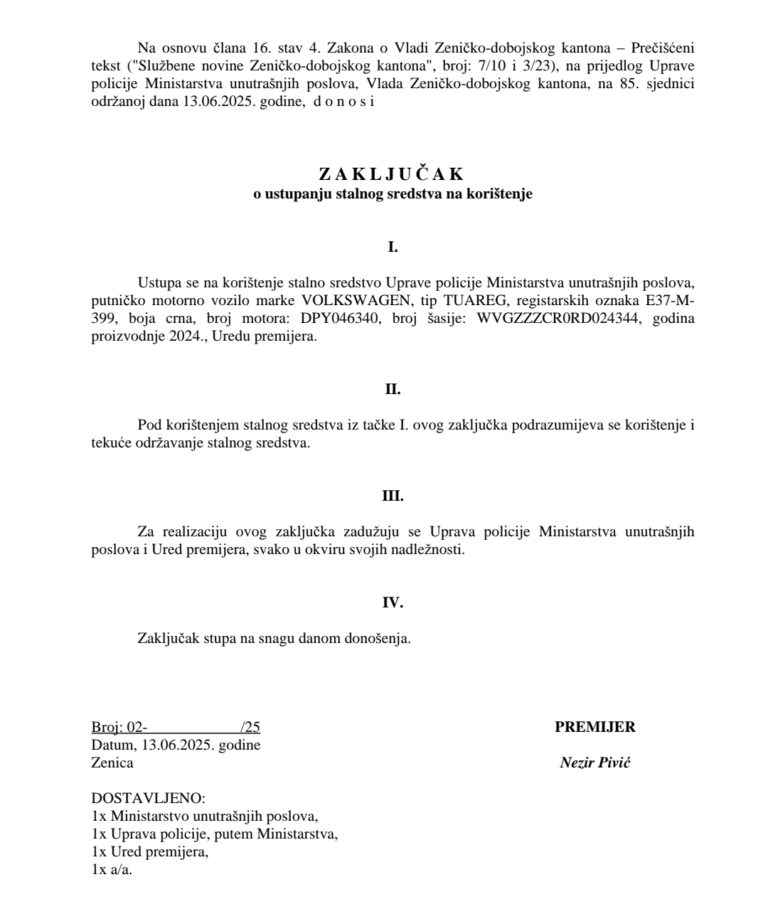 Vlada Zeničko-dobojskog kantona (ZDK) na sjednici održanoj 13. juna 2025. godine donijela je zaključak kojim se jedno službeno vozilo Uprave policije MUP-a ZDK ustupa na korištenje Uredu premijera ZDK, Nezira Pivića (SDA).