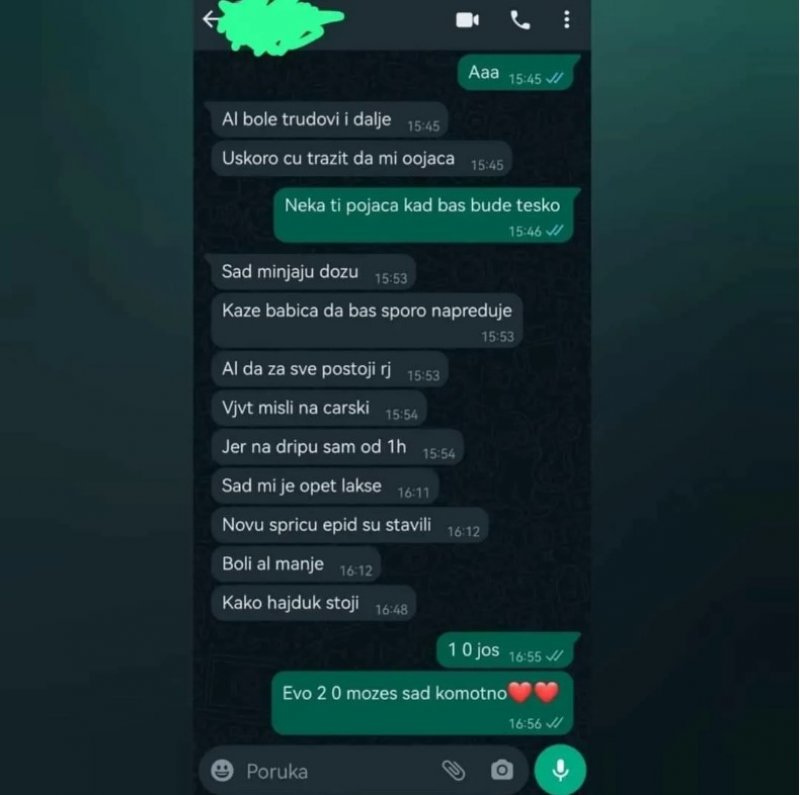 Po onome što internetom kola, trudnica se krajem prvog poluvremena u WhatsApp dopisivanju (s mužem?) požalila kako ima jake i bolne trudove, ali i da ‘će uskoro tražit da joj pojačaju‘ (vjerojatno misli na drip – infuziju koja stimulira trudove).
