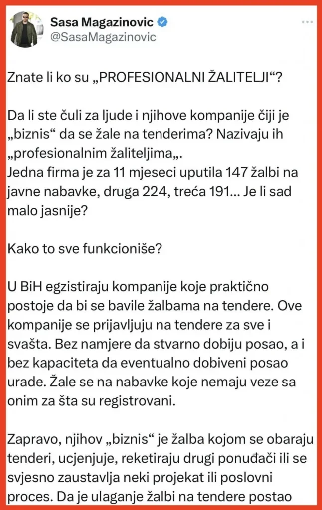 Podsjetimo, u martu ove godine poslanik u Predstavničkom domu Parlamentarne skupštine BiH Saša Magazinović počeo je javno da ukazuje na problem profesionalnih žalioca, a u vezi toga je postavio i poslaničko pitanje Agenciji za javne nabavke BiH. Oni su mu, prenijeli su tada mediji, odgovorili da je problem eskalirao i da je Agencija iz svoje nadležnosti pokrenula aktivnosti, dobila i prikupila informacije i dokaze o „profesionalnim žaliteljima“.