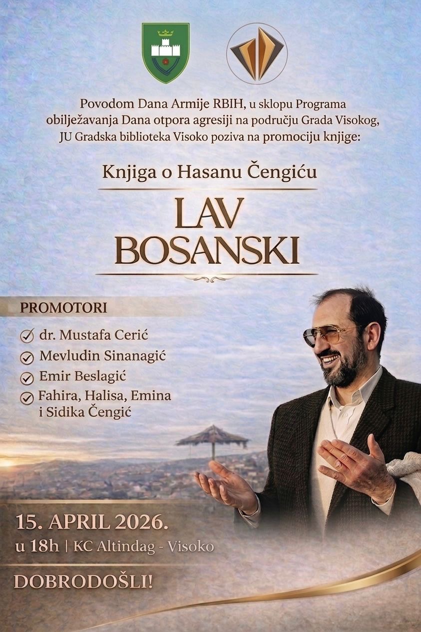 U okviru Programa obilježavanja Dana otpora agresiji na području Grada Visokog, a u saradnji sa predstavnicima Grada Visokog i JU ”Gradska biblioteka Visoko” na dan Armije RBIH, 15. aprila 2026. godine, održat će se promocija knjige “Lav bosanski” u 18:00, u prostorijama Kulturnog centra Altindag – Visoko. Promotori knjige će biti dr. Mustafa Cerić, Mevludin Sinanagić, Emir Bešlagić, te koautorice knjige, Fahira, Halisa, Emina i Sidika Čengić. Svi ste pozvani!