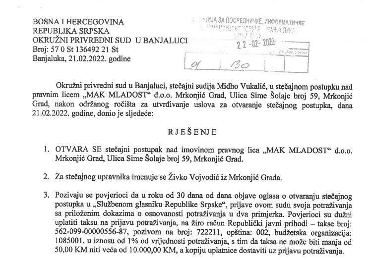 Prošle godine je obustavilo proizvodnju da bi ovih dana Okružni sud u Banjaluci otvorio stečaj i to na zahtjev direktora Nevene Baneke koja je ostala jedina zaposlena i to na pola radnog vremena, odnosno četiri sata.