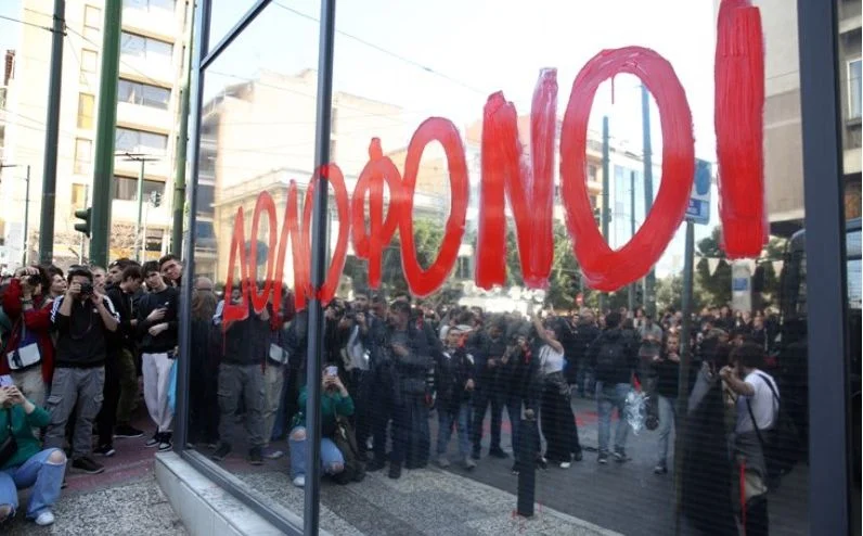 Riječ “Ubojice” ispisana je crvenim slovima na prozoru sjedišta tvrtke u Ateni ispred kojeg se okupilo više od 5000 ljudi.