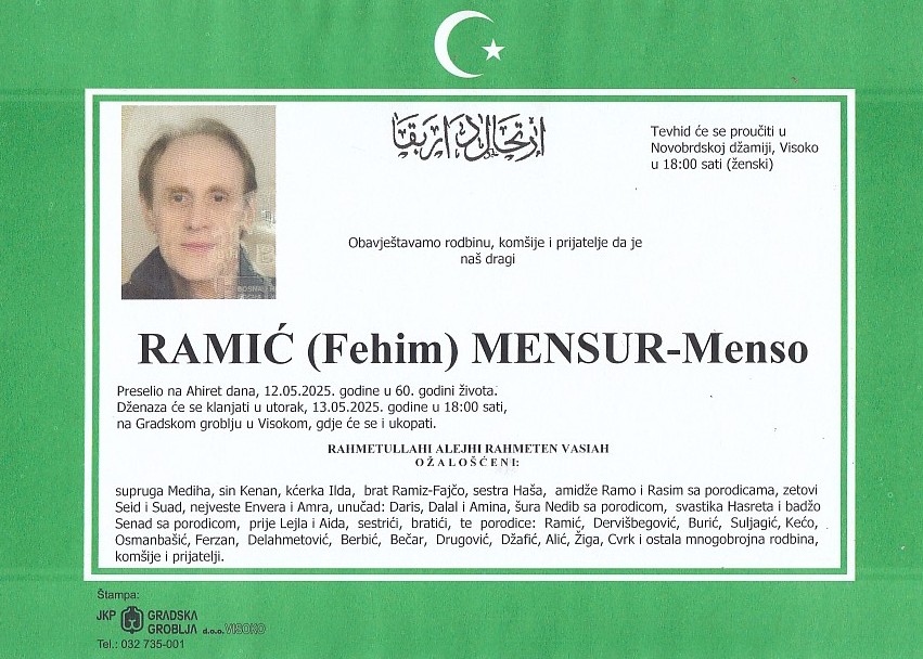 RAMIĆ (Fehim) MENSUR 13.05.2025. godine u 18:00 sati 13. Maja 2025. RAMIĆ (Fehim) MENSUR 13.05.2025. godine u 18:00 sati