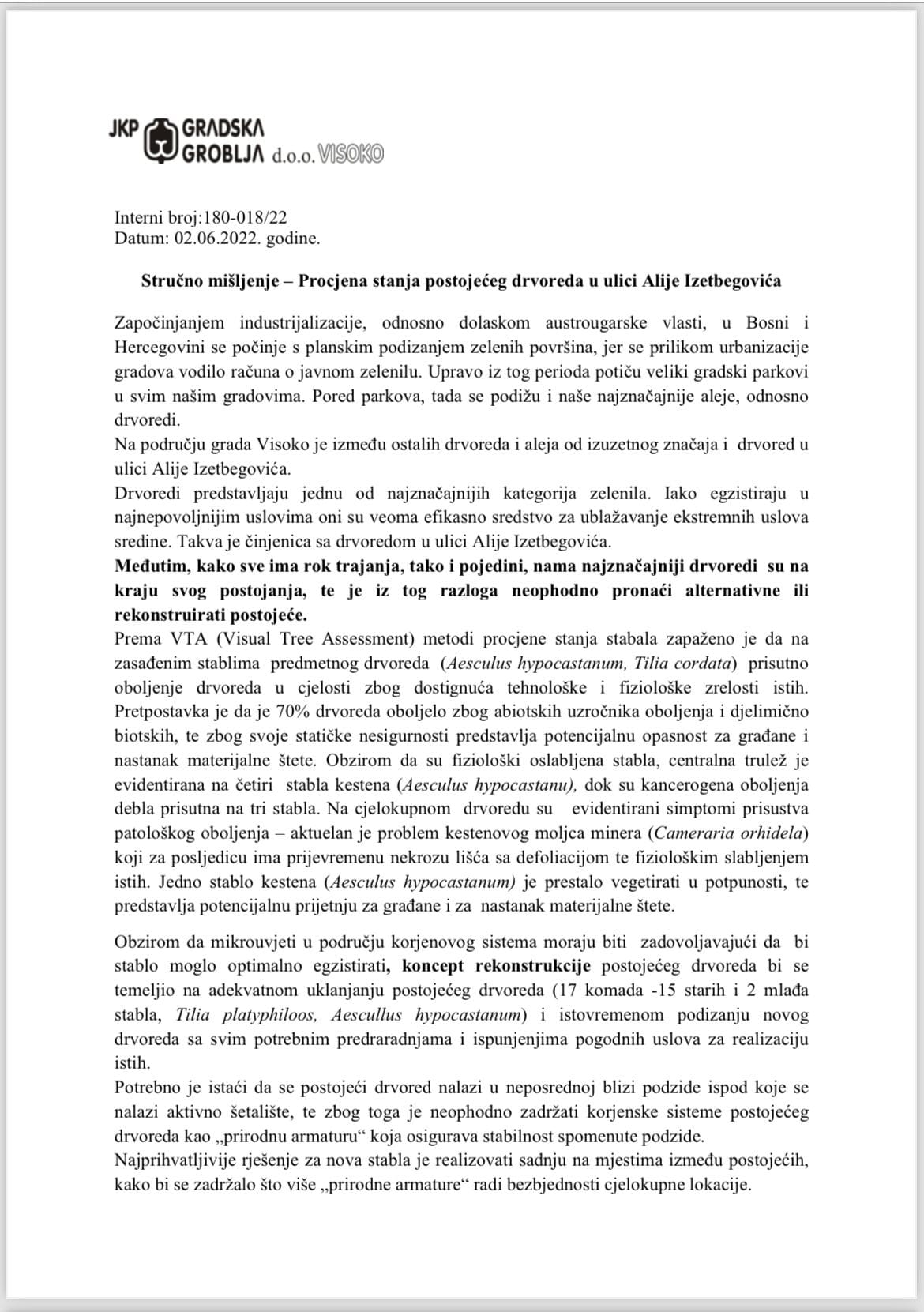Prema informacijama iz Gradske uprave, stabla su uklonjena zbog “oboljenja i starosti”, navodno potvrđenog od strane stručnjaka iz JKP Gradska groblja Visoko, uz argument da je postojeći drvored predstavljao potencijalnu opasnost.