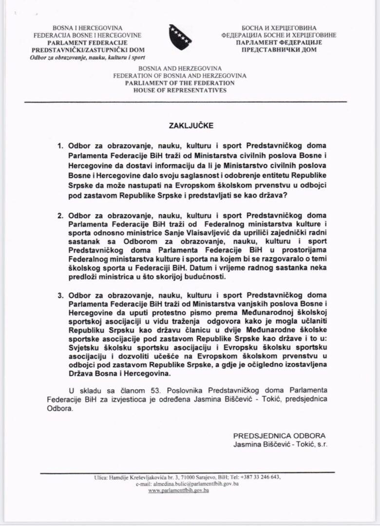 Biščević Tokić navodi da su članovi Odbora od federalne ministrice kulture i sporta Sanje Vlaisavljević zatražili što hitnije održavanje radnog sastanka na kojem će se razgovarati o temi školskog sporta u Federaciji BiH.
