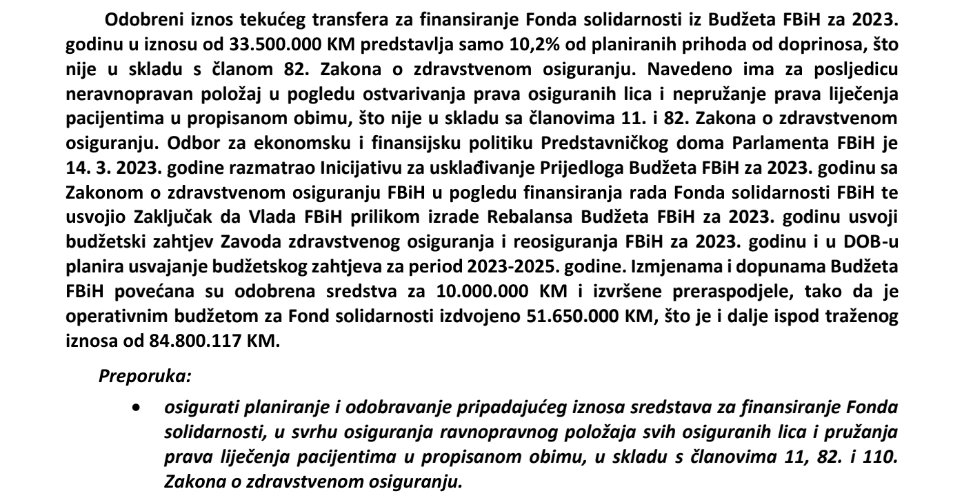 „Odobreni iznos tekućeg transfera za finansiranje Fonda solidarnosti iz Budžeta FBiH za 2023. godinu u iznosu od 33.500.000 KM predstavlja samo 10,2% od planiranih prihoda od doprinosa, što nije u skladu s članom 82. Zakona o zdravstvenom osiguranju. Navedeno ima za posljedicu neravnopravan položaj u pogledu ostvarivanja prava osiguranih lica i nepružanje prava liječenja pacijentima u propisanom obimu, što nije u skladu sa članovima 11. i 82. Zakona o zdravstvenom osiguranju“, upozoravaju revizori.