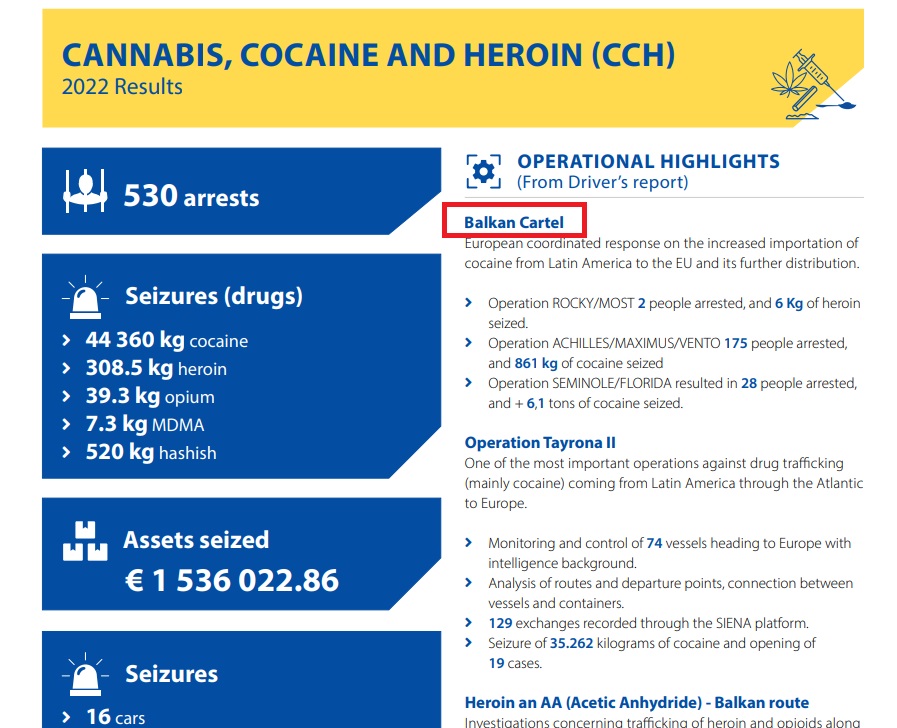 U izvještaju je kao jedan od najopasniji kartela istaknut „Balkanski kartel“. Evropski koordinirani odgovor na povećani uvoz kokaina iz Latinske Amerike u EU i njegove daljnje distribucije, prema izvještaju, izgledao je ovako: