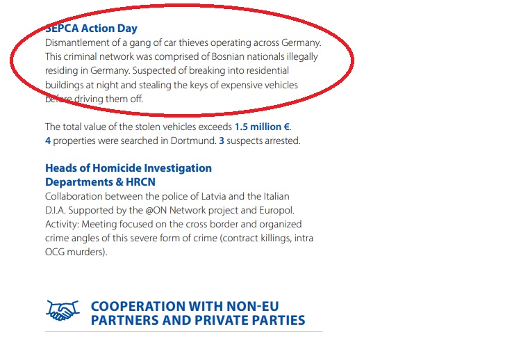 BiH je spomenuta u kontekstu razbijanje bande kradljivaca automobila koja djeluje diljem Njemačke. Ovu kriminalnu mrežu ilegalno su činili bh. državljani nastanjeni u Njemačkoj. Osumnjičeni su za provale u stambene zgrade noću i krađu ključeva skupih vozila. Ukupna vrijednost ukradenih vozila premašuje 1,5 miliona eura.