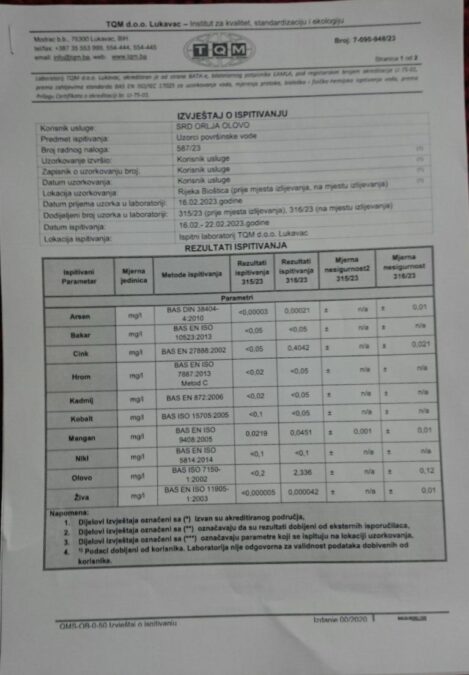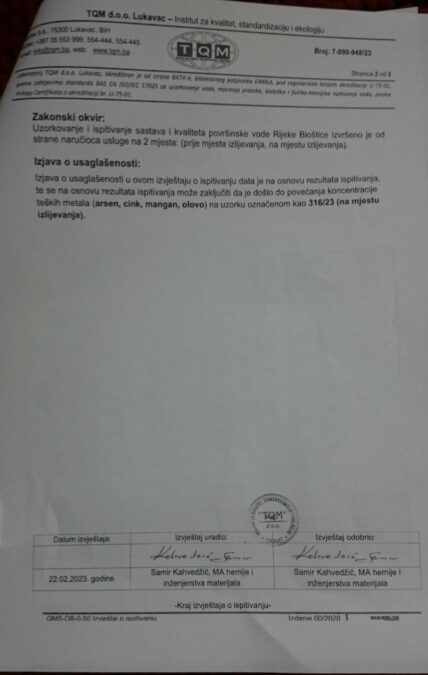 „Dana 10.02.2023.godine izvršena je analiza vode izvorišta Zeleni vir na teške metale (Pb-olovo). Ispitani uzorak odgovara propisima Pravilnika o zdravstvenoj ispravnosti vode za piće. Analiza vode obavljena je u Zavodu za javno zdravstvo Federacije BiH. Uzimajući u obzir sve do sada poznate okolnosti i informacije povezane za akcident na rijeci Bioštici od 6. i 7. februara ove godine, ostalo je nejasno koliki su razmjer i stepen štete prouzrokovani na kvalitetu vodotoka rijeke Bioštice i nizvodno rijeke Krivaje, a s tim povezano kako i u kom obimu se to manifestovalo na biljni i životinjski svijet ovih vodotoka“, kaže se u odgovoru koji potpisuje Safet Kulo, stručni suradnik za zaštitu okoliša.