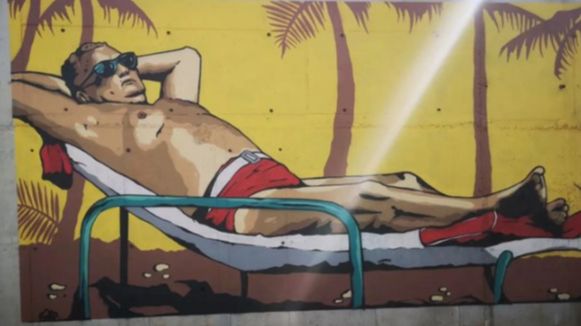 Mural prikazuje Tita zavaljenog u ležaljci pod palmama, s naočarima na glavi i prekrštenim nogama.