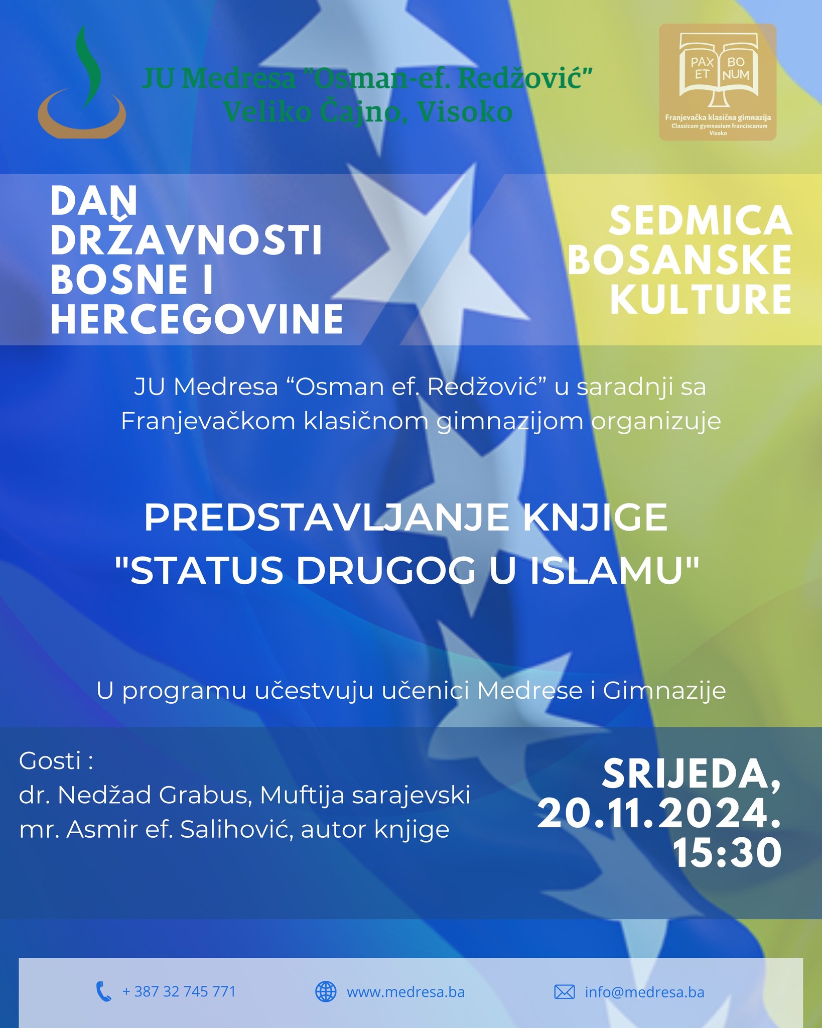 Ove godine, manifestacija započinje u srijedu, 20. novembra u 15.30 sati, kada će u amfiteatru Medrese biti upriličen program u saradnji sa Franjevačkom klasičnom gimnazijom Visoko, u okviru kojeg će biti organizovano predstavljanje knjige “Status drugog u islamu”, autora mr. Asmira ef. Salihovića.