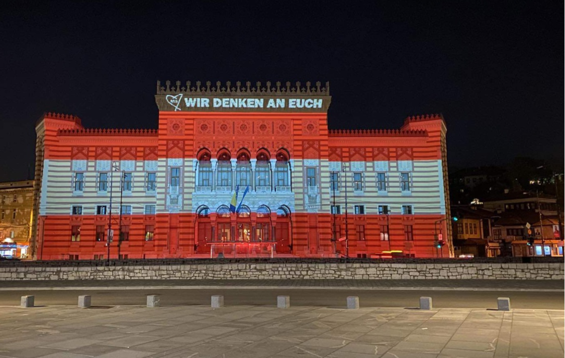 Osvjetljenjem Vijećnice u bojama zastave Republike Austrije, Grad Sarajevo zajedno sa svojim građanima želi iskazati saosjećanje i solidarnost sa porodicama ubijenih i povrijeđenih u terorističkom napadu u Beču.