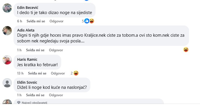 “Seljanko spusti noge i više radi na kulturi i bontonu ako hoćeš da ispadneš dama, al dabogda.”; “Ne drže se noge na naslonjačima od sjedišta.”; “Drži noge ko seljo na naslonjaču.”…nižu se komentari ispod objave.