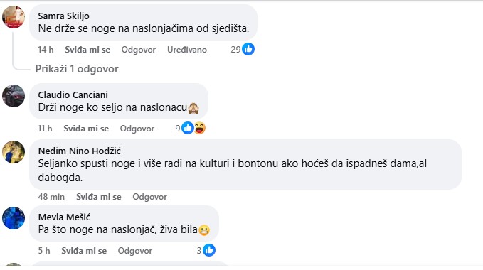 “Seljanko spusti noge i više radi na kulturi i bontonu ako hoćeš da ispadneš dama, al dabogda.”; “Ne drže se noge na naslonjačima od sjedišta.”; “Drži noge ko seljo na naslonjaču.”…nižu se komentari ispod objave.