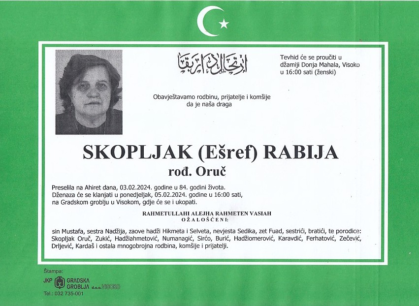 SKOPLJAK (Ešref) RABIJA 05.02.2024. godine u 16:00 sati 4. Februara 2024. SKOPLJAK (Ešref) RABIJA 05.02.2024. godine u 16:00 sati