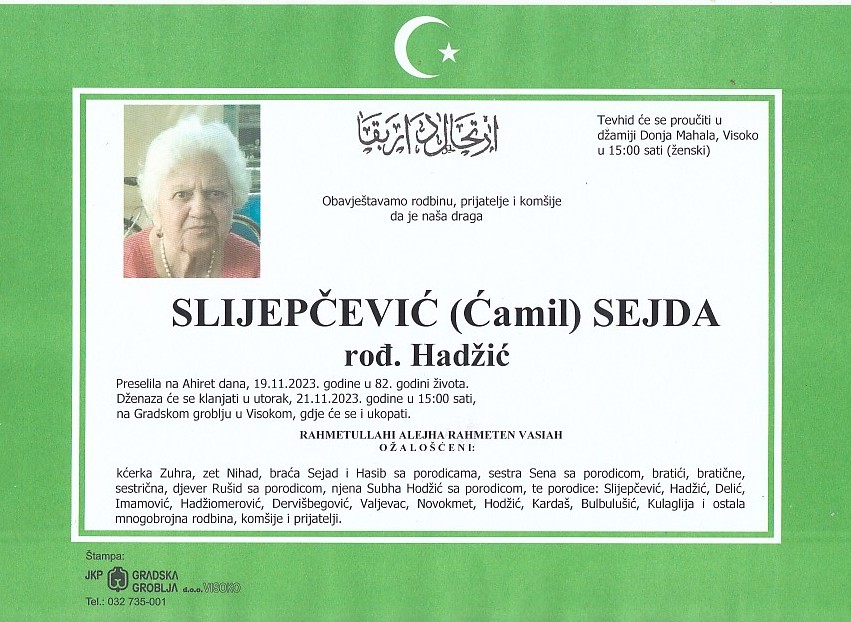 SLIJEPČEVIĆ (Ćamil) SEJDA 21.11.2023. godine u 15:00 sati 21. Novembra 2023.22. Novembra 2023. SLIJEPČEVIĆ (Ćamil) SEJDA 21.11.2023. godine u 15:00 sati