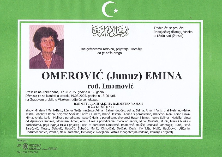 OMEROVIĆ (Junuz) EMINA 19.08.2025. u 18:00 sati