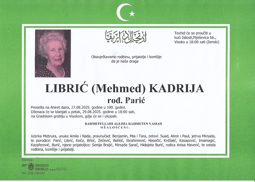 LIBRIĆ (Mehme) KADRIJA 29.08.2025. u 18:00 sati