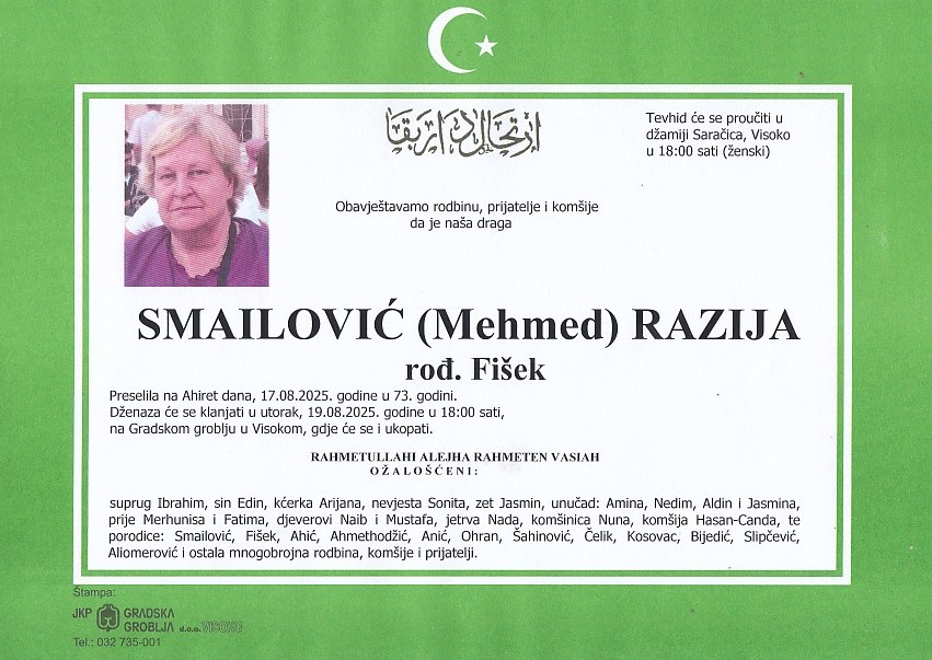 SMAILOVIĆ (Mehmed) RAZIJA 19.08.2025. u 18:00 sati