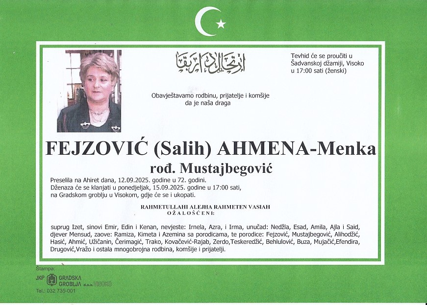 FEJZOVIĆ (Salih) AHMENA 15.09.2025. u 17:00 sati