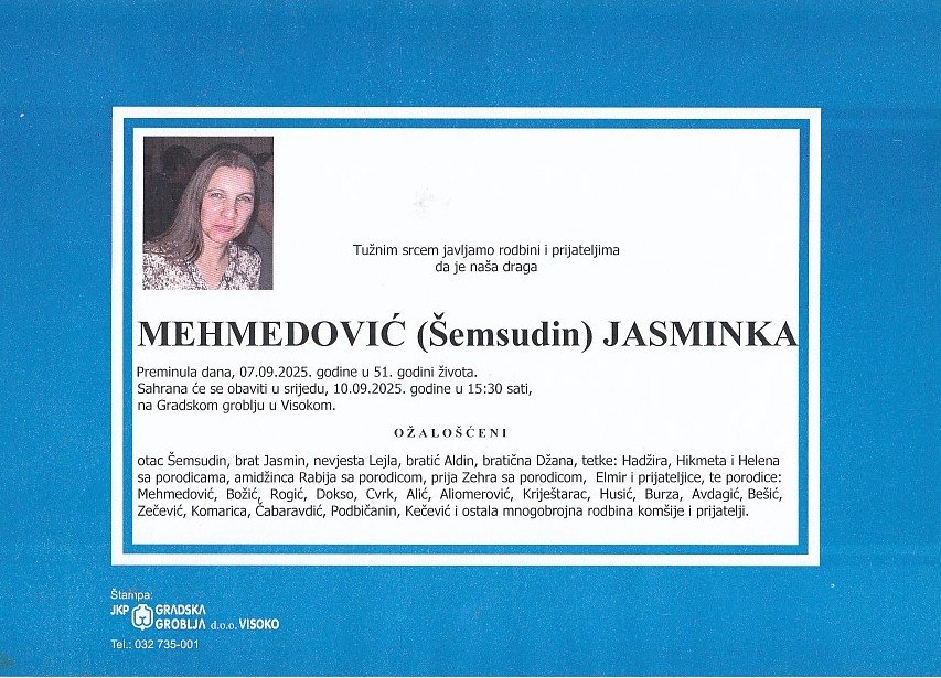 MEHMEDOVIĆ (Šemsudin) JASMINKA 10.09.2025. u 15:30 sati