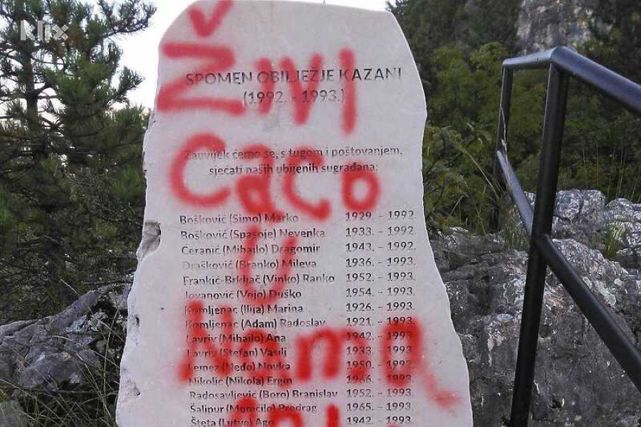 “Živi Caco u nama 10 br”, ispisano je crvenim sprejom na spomeniku.