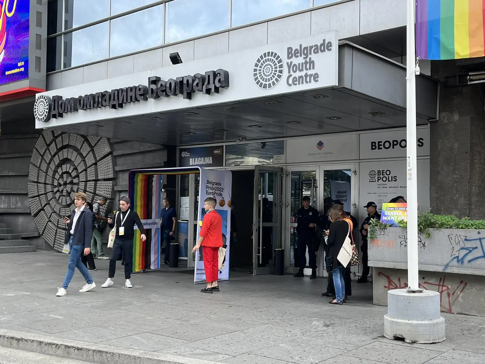 Prvo sam posjetio Dom omladine, on je trenutno pretvoren u Pride infohouse. Mjesto na kojem možete dobiti sve informacije, registrovati se, podići press akreditacije, kupiti suvenire koje je dizajnirao aktivista Uroš Tanacković specijalno za Europride 2022. Ljudi nisu pretjerano ni sretni, ne osjeti se prevelika euforija, ali ne osjeti se ni strah. Možda jer je ispred 10 policajaca, a oko Doma ih ima minimalno još toliko.