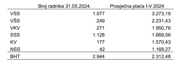 Prosječna isplaćena neto plaća u BH Telecomu u periodu I-V 2024. godine po stručnim spremama je kako slijedi u tabeli: