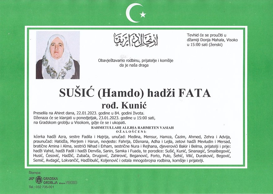 SUŠIĆ (Hamdo) FATA 23.01.2023. godine u 15:00 sati 22. Januara 2023. SUŠIĆ (Hamdo) FATA 23.01.2023. godine u 15:00 sati