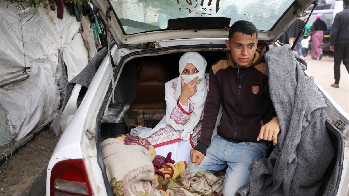 Ibrahim i Narmin Abed, koji su bili primorani napustiti domove i skloniti se u školu UNRWA, vjenčali su se u gradu Deir Al-Balahu...
