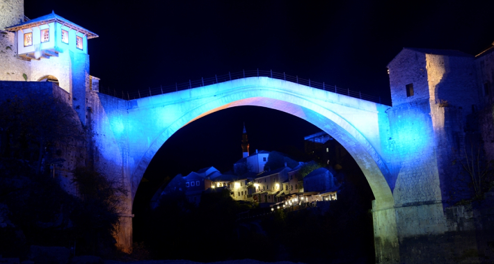 U znak podrške obilježavanju Svjetskog dana djeteta, Grad Mostar je obojio u plavo kamen Starog mosta, javlja Anadolu Agency (A)A.