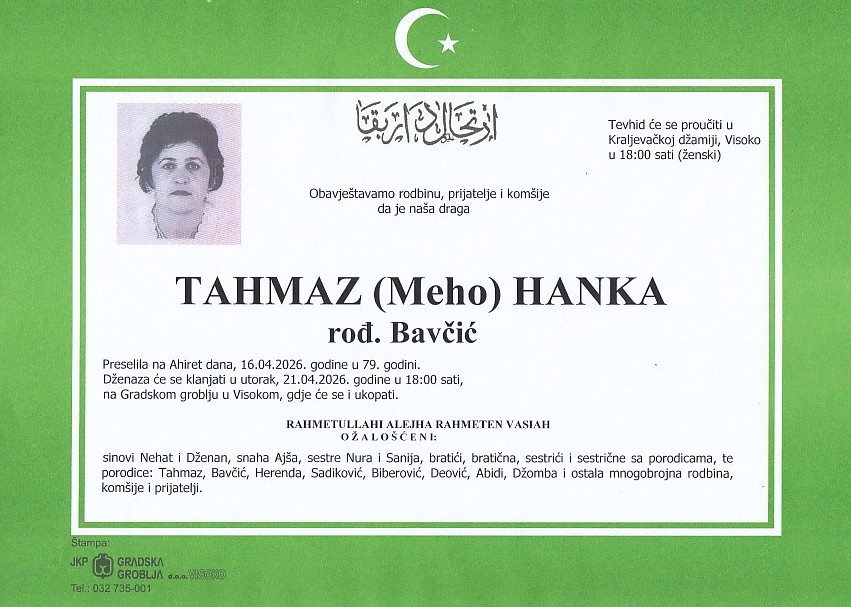 TAHMAZ (Meho) HANKA 21.04.2026. u 18:00 sati
