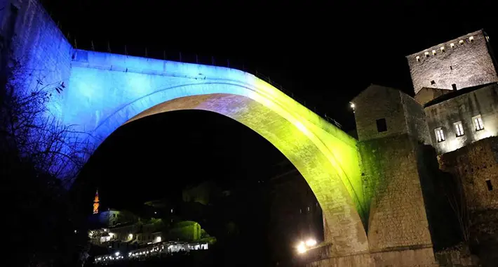 Kao znak solidarnosti s narodom Ukrajine mostarski Stari most večeras je osvijetljen bojama zastave te zemlje. Nakon što je dan ranije sarajevska vijećnica...