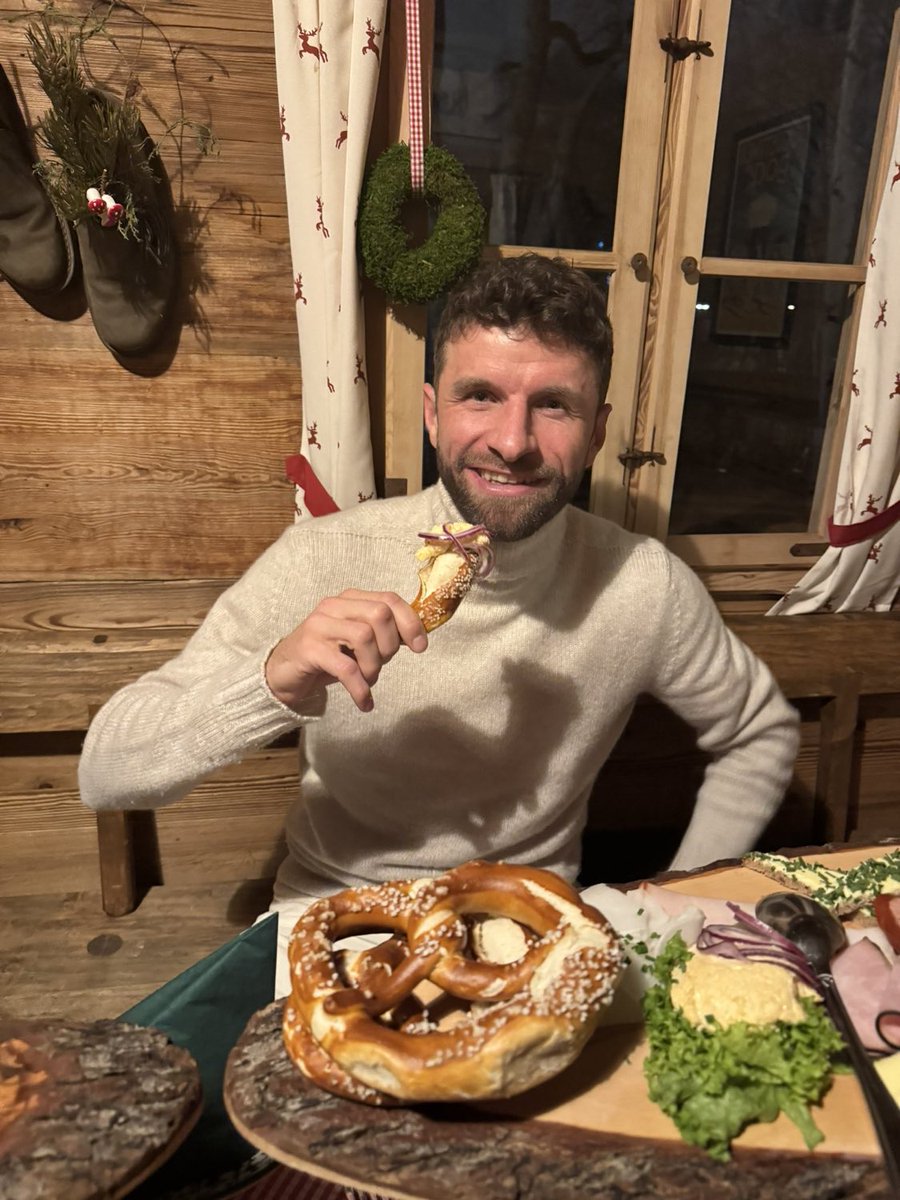 Tačno za treći advent, Thomas Müller se javlja iz svoje bavarske domovine – na svoj tipični način. Na novoj fotografiji vidi se kako se smije dok jede popularno bavarsko pecivo (breze) i uživa u klasičnoj bavarskoj plati sa kobasicama i sirom.