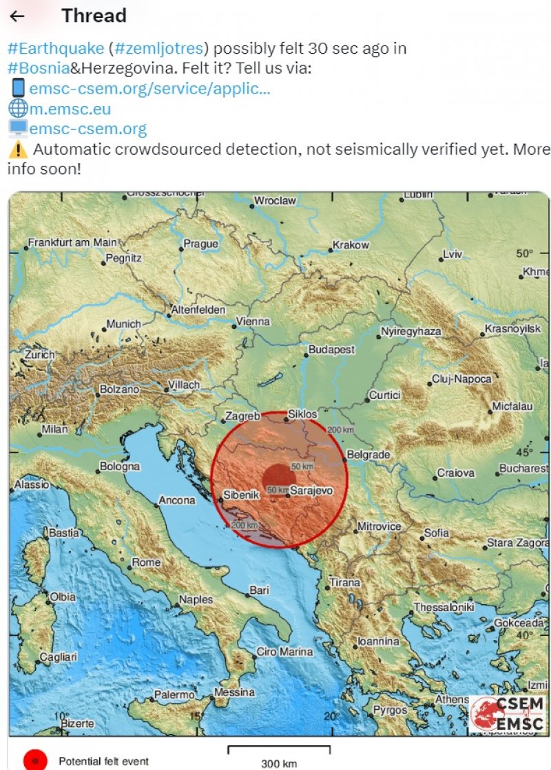 Na zvaničnoj stranici EMSC-a još uvijek nije objavljen zvanični podatak o jačini jutrošnjeg podrhtavanja tla.