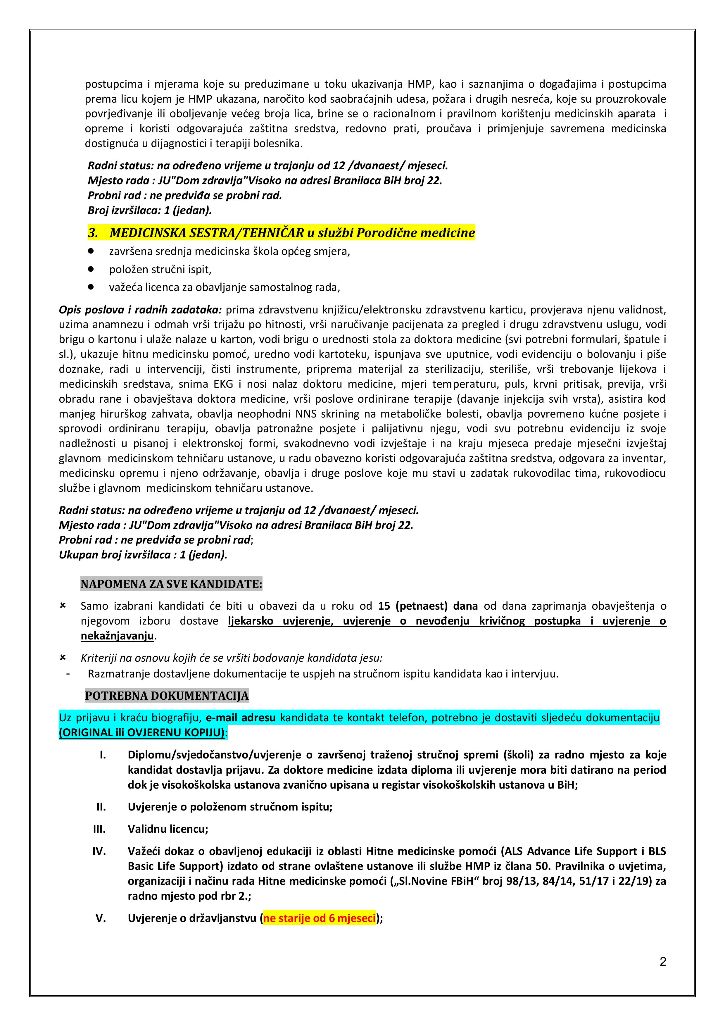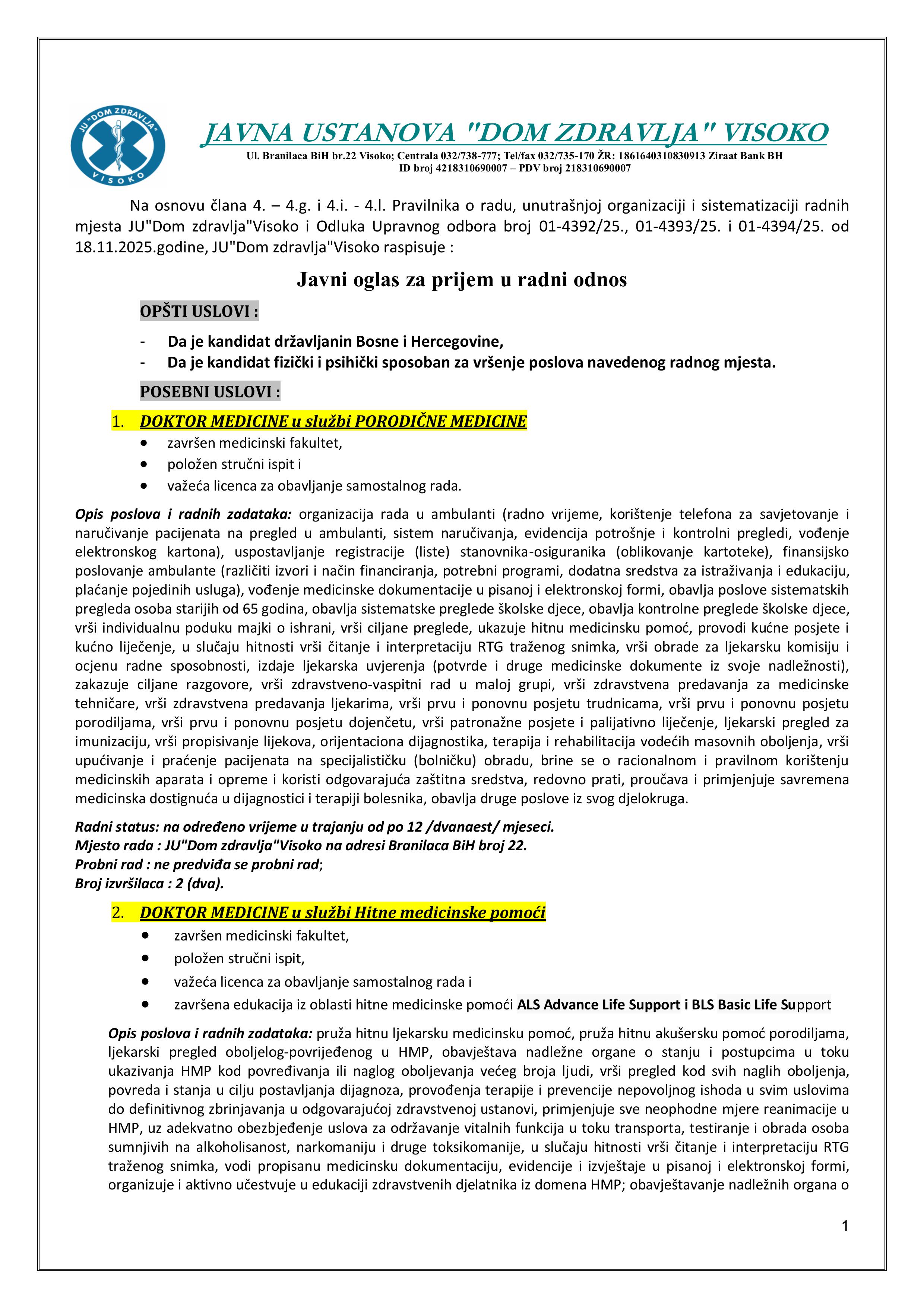 Na osnovu člana 4. – 4.g. i 4.i. – 4.l. Pravilnika o radu, unutrašnjoj organizaciji i sistematizaciji radnih mjesta JU “Dom zdravlja” Visoko i Odluka Upravnog odbora broj 01-4392/25., 01-4393/25. i 01-4394/25. od 18.11.2025.godine, JU “Dom zdravlja” Visoko raspisuje :