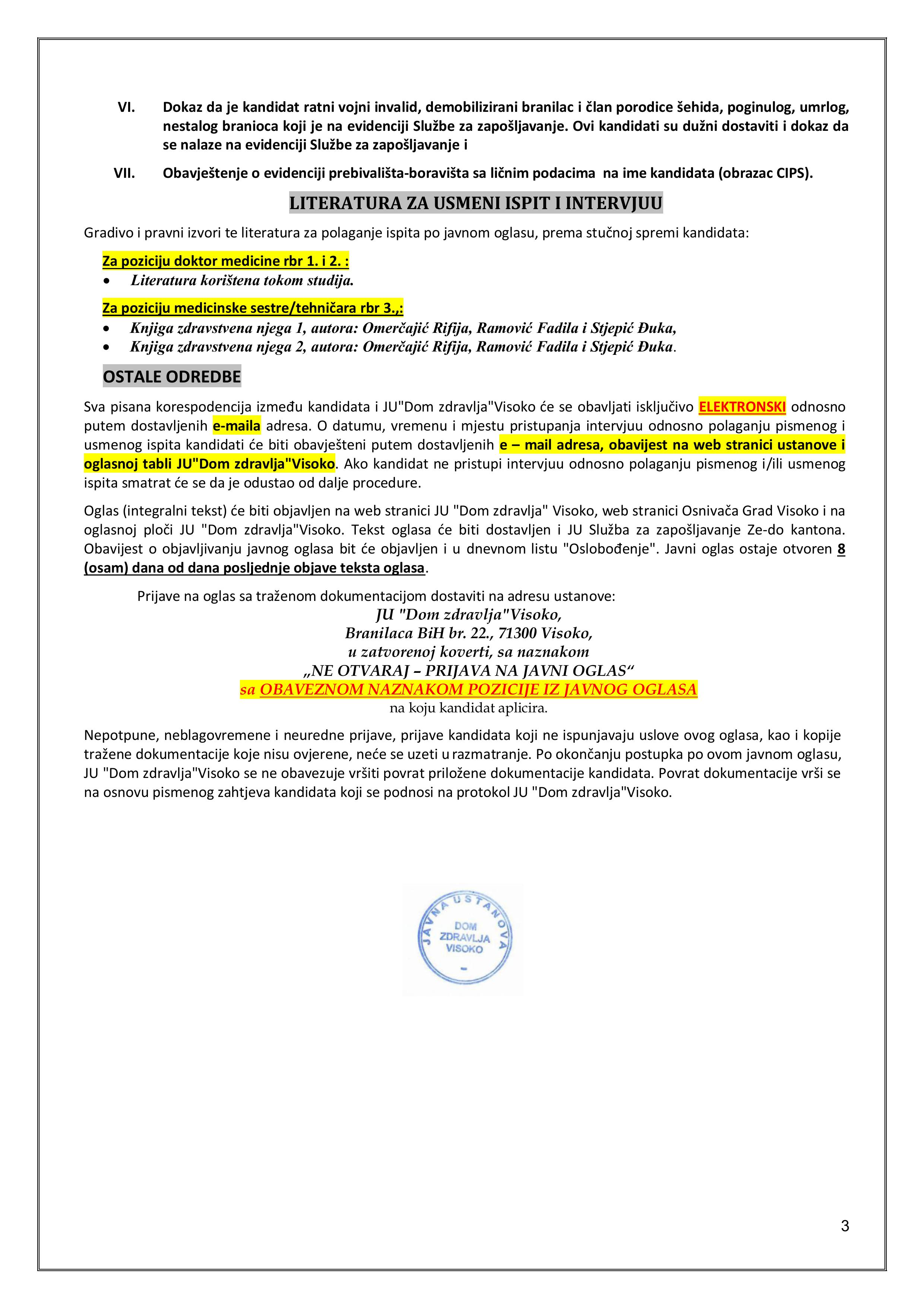 Oglas (integralni tekst) će biti objavljen na web stranici JU “Dom zdravlja” Visoko, web stranici Osnivača Grad Visoko i na oglasnoj ploči JU “Dom zdravlja” Visoko. Tekst oglasa će biti dostavljen i JU Služba za zapošljavanje Ze-do kantona. Obavijest o objavljivanju javnog oglasa bit će objavljen i u dnevnom listu “Oslobođenje”. Javni oglas ostaje otvoren 8 (osam) dana od dana posljednje objave teksta oglasa.