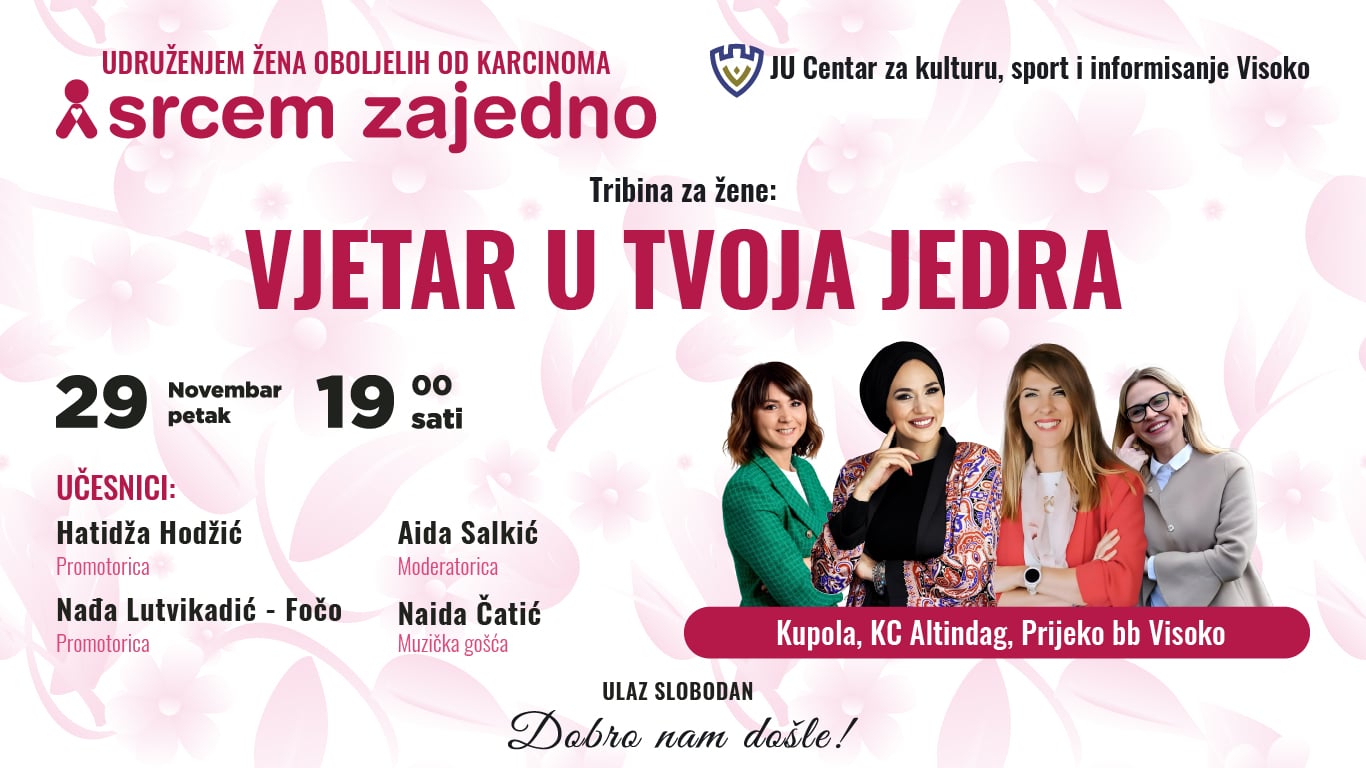 Pred nama je još jedna inspirativna tribina pod nazivom “Vjetar u tvoja jedra”, koju organizuje Udruženje “Srcem zajedno” iz Visokog. Kako su istakle članice Udruženja, ova tribina će biti još jedna prilika da se okupimo, osnažimo jedne druge i uživamo u sadržaju.