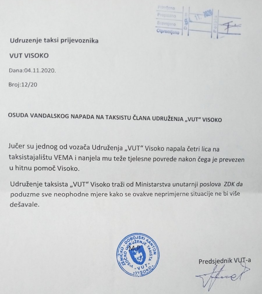 Udruženje taksista „VUT“ Visoko traži od Ministarstva unutarnji poslova ZDK da poduzme sve neophodne mjere kako se ovakve neprimjerne situacije ne bi više dešavale.